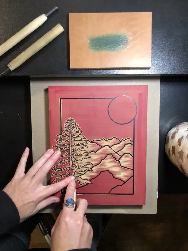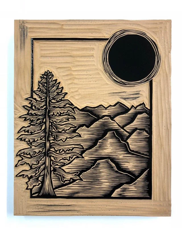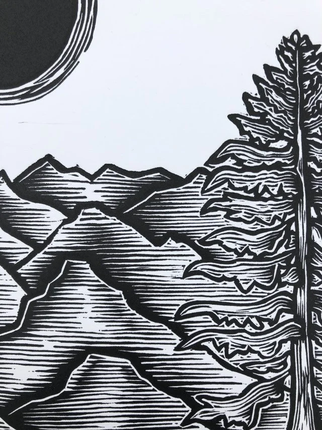 The original motif was carved from linoleum. I retired the block and now screen print the design.